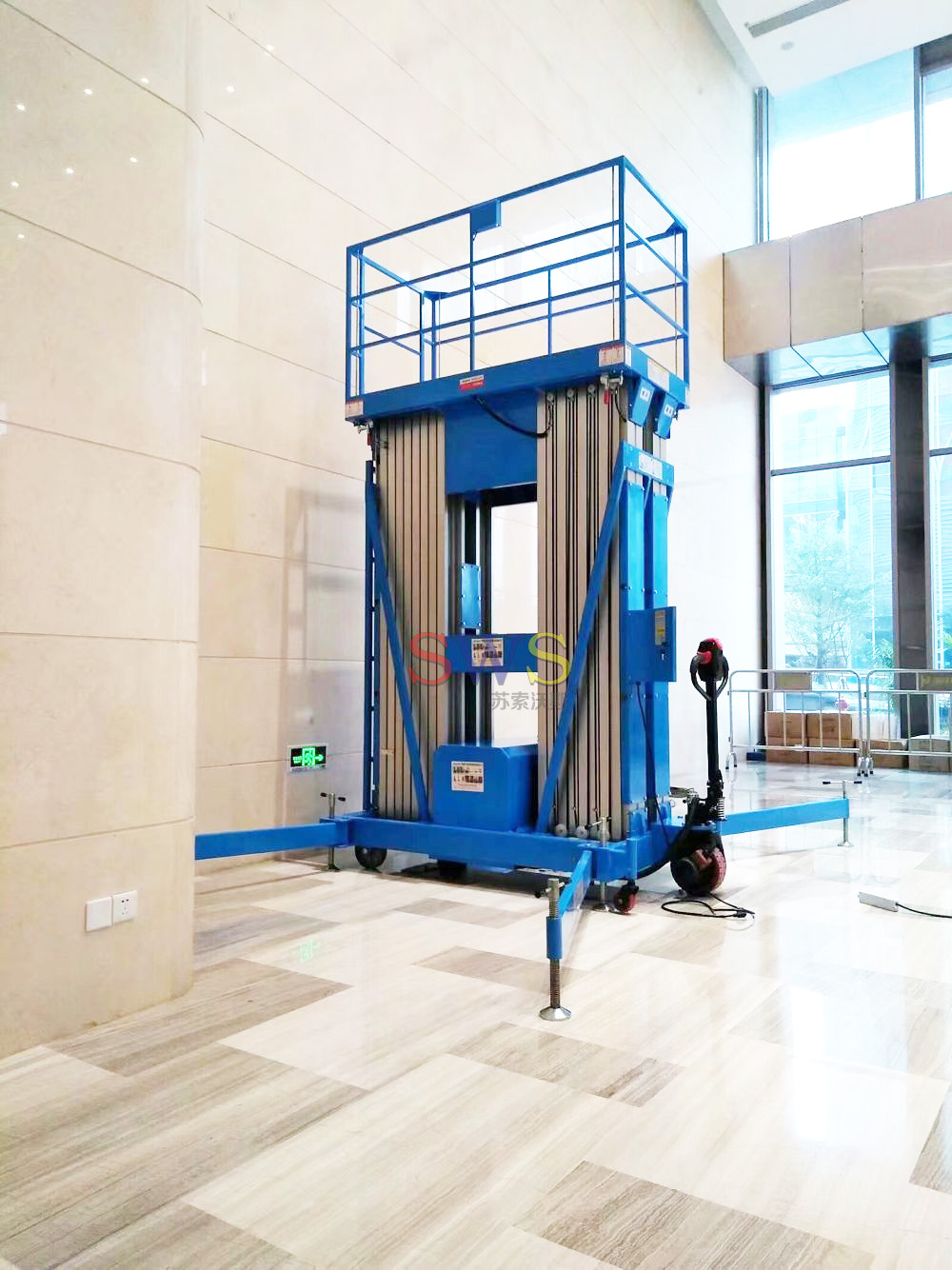 液壓起升,設(shè)有緊急下降閥裝置,具有輕便、靈活的特性,適用單人作業(yè)。